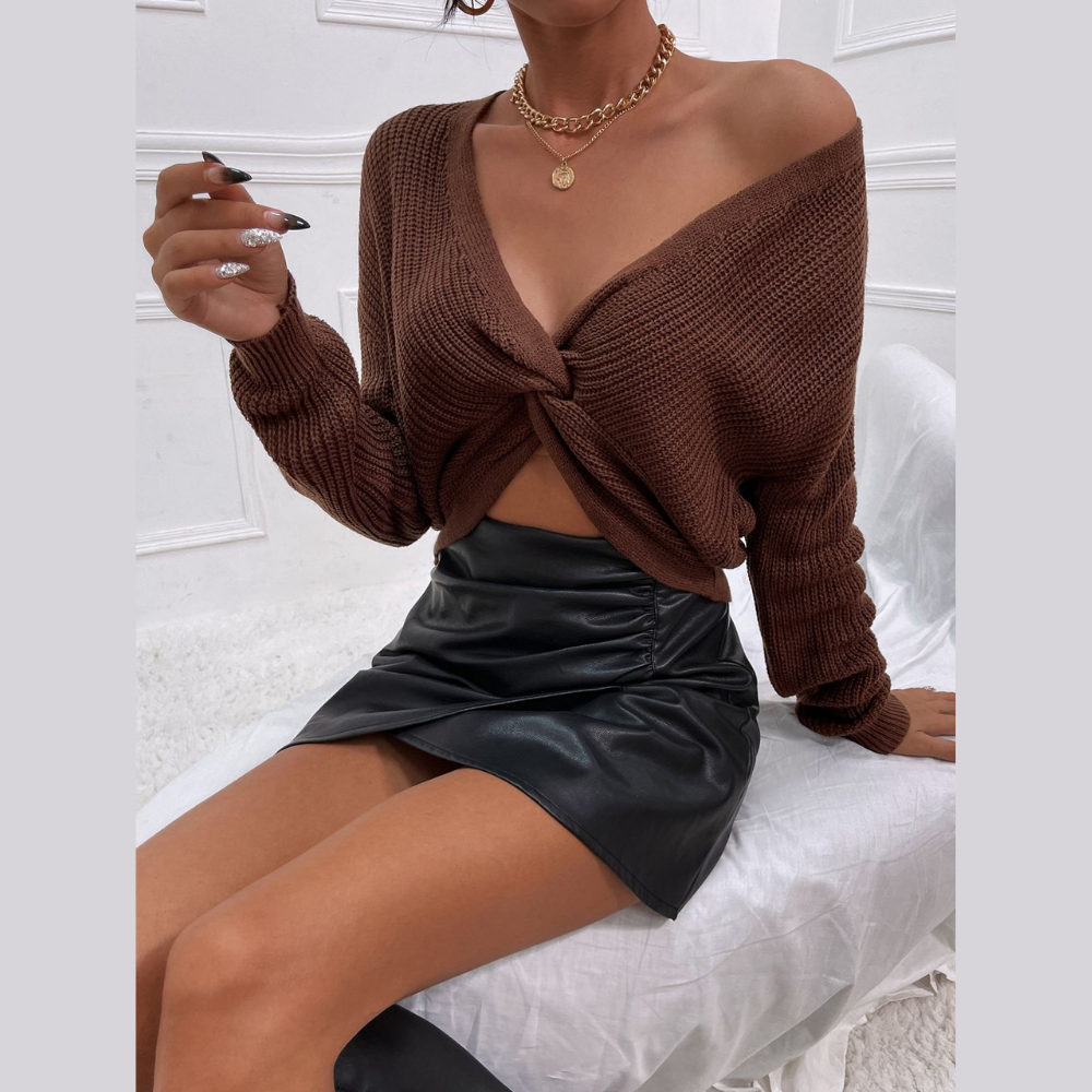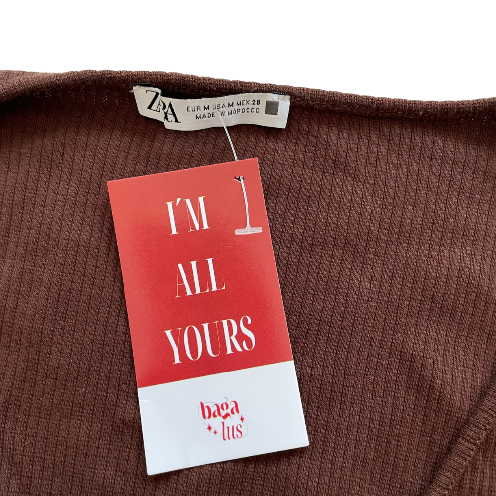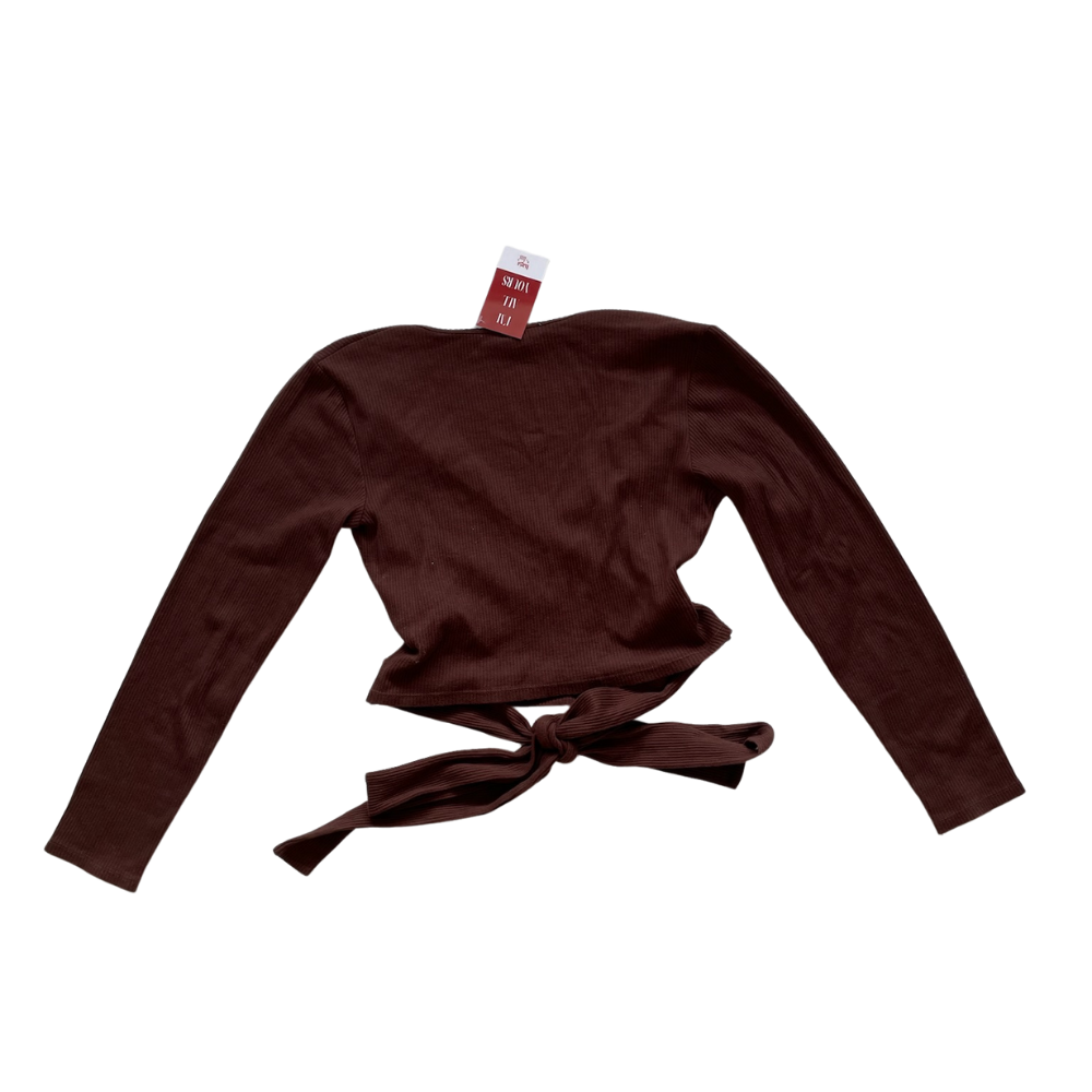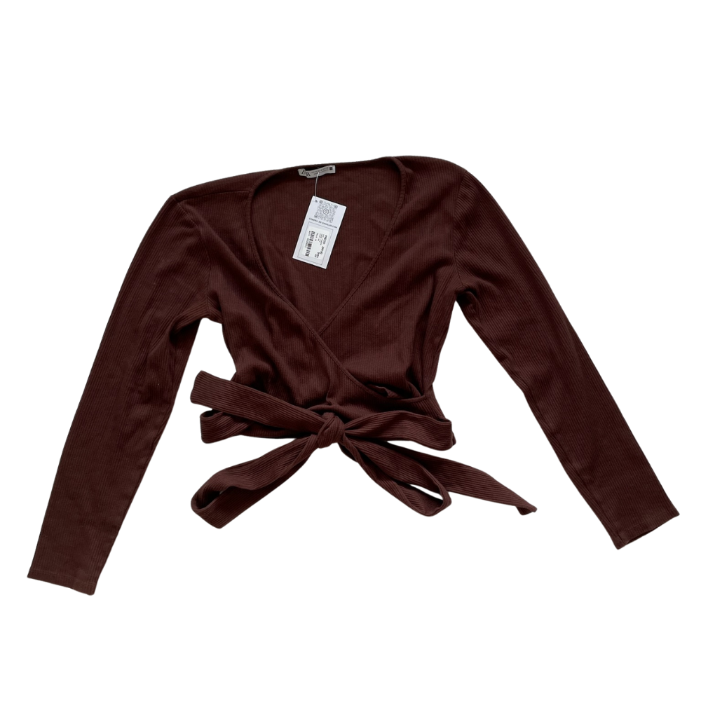 Tela acanalada suave y ligeramente elástica, esta blusa de escote cruzado destaca por su diseño envolvente y cinturón integrado que permite ajustar la silueta de forma delicada y estilizada. Su tono café profundo y textura sutil aportan un aire cálido, femenino y muy elegante.