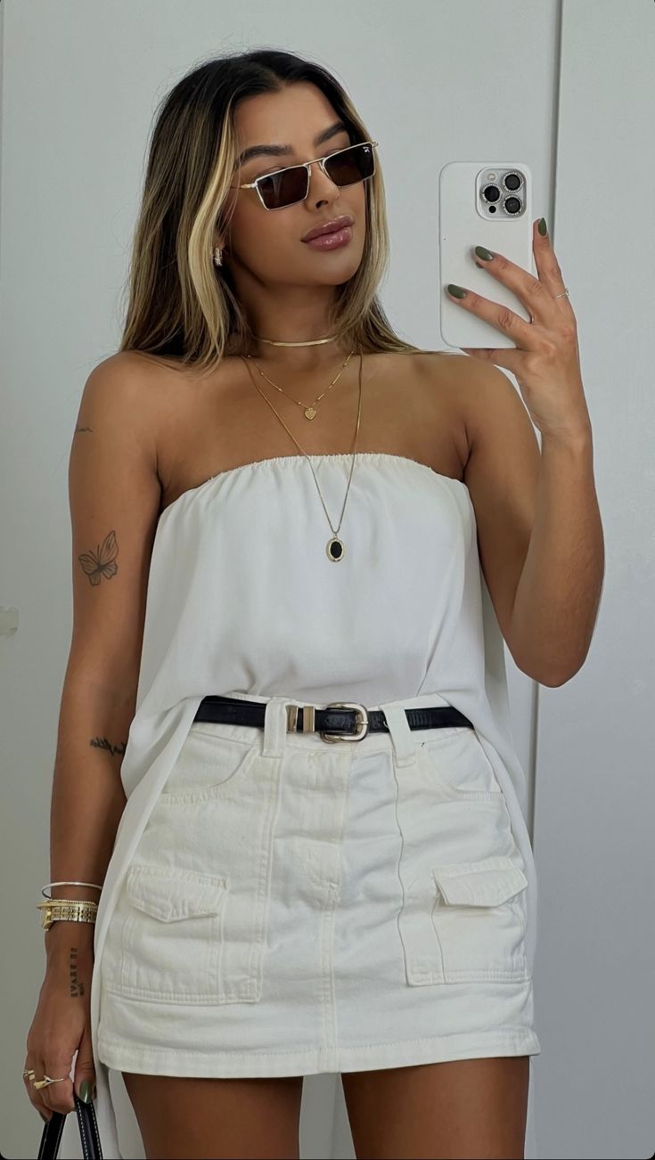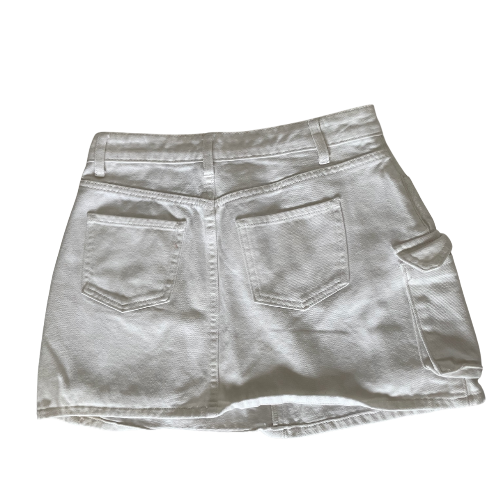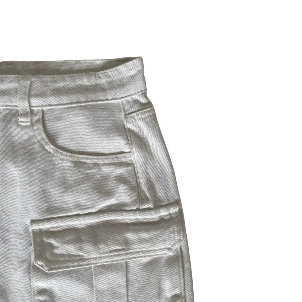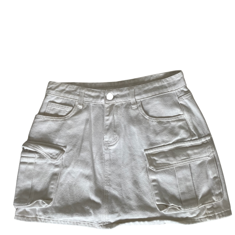 Mini falda blanca tipo cargo con bolsillos amplios al frente y cierre de botón metálico. Confeccionada en mezclilla estructurada, combina el estilo utilitario con un toque moderno. Ideal para looks casuales. 🤍🧢✨