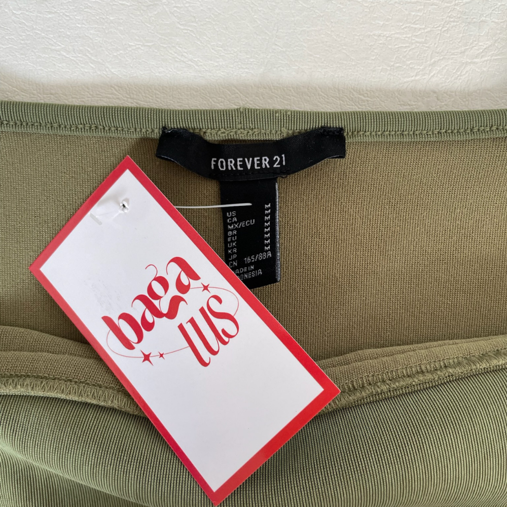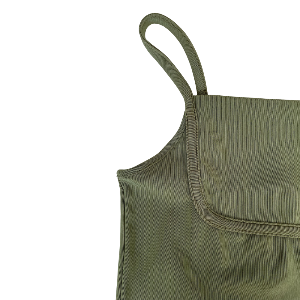 Vestido corto verde oliva con tirantes delgados y escote recto. De silueta ajustada y tejido elástico tipo canalé, es una prenda versátil que puede usarse tanto casual o más arreglada. 🌿✨