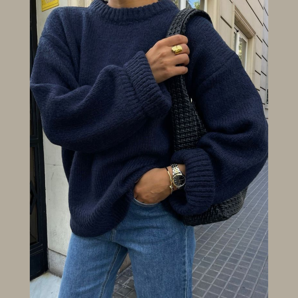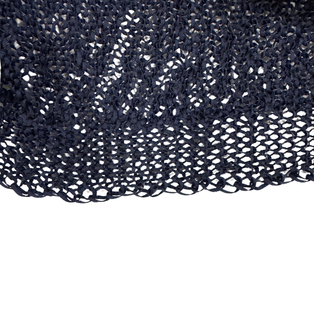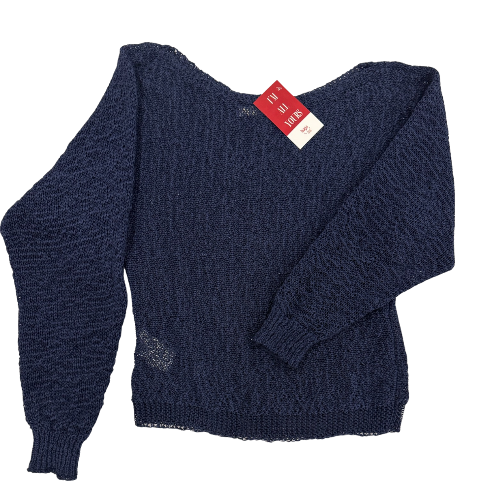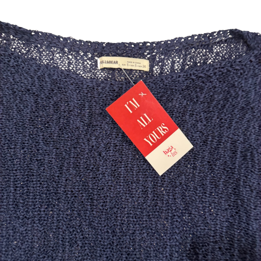 Suéter de punto ligero en tono azul marino con textura tejida abierta que le da un aire relajado y artesanal. Presenta escote en “V” pronunciado y mangas tipo globo que aportan volumen y un toque bohemio. La silueta es ligeramente holgada, perfecta para llevar sobre tops básicos, vestidos o incluso como capa ligera en climas templados. Un básico versátil con mucha personalidad para looks casuales.