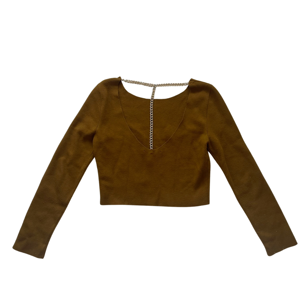 Acabado tipo gamuza suave al tacto, esta blusa de corte cropped y manga larga destaca por su silueta limpia y estructura delicada. El detalle de cadena metálica en la espalda aporta un contraste sutil pero llamativo, elevando la pieza con un toque moderno, sensual y elegante.