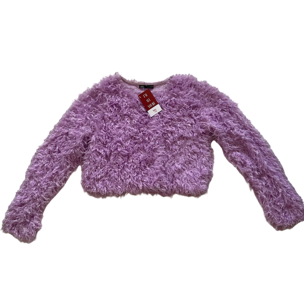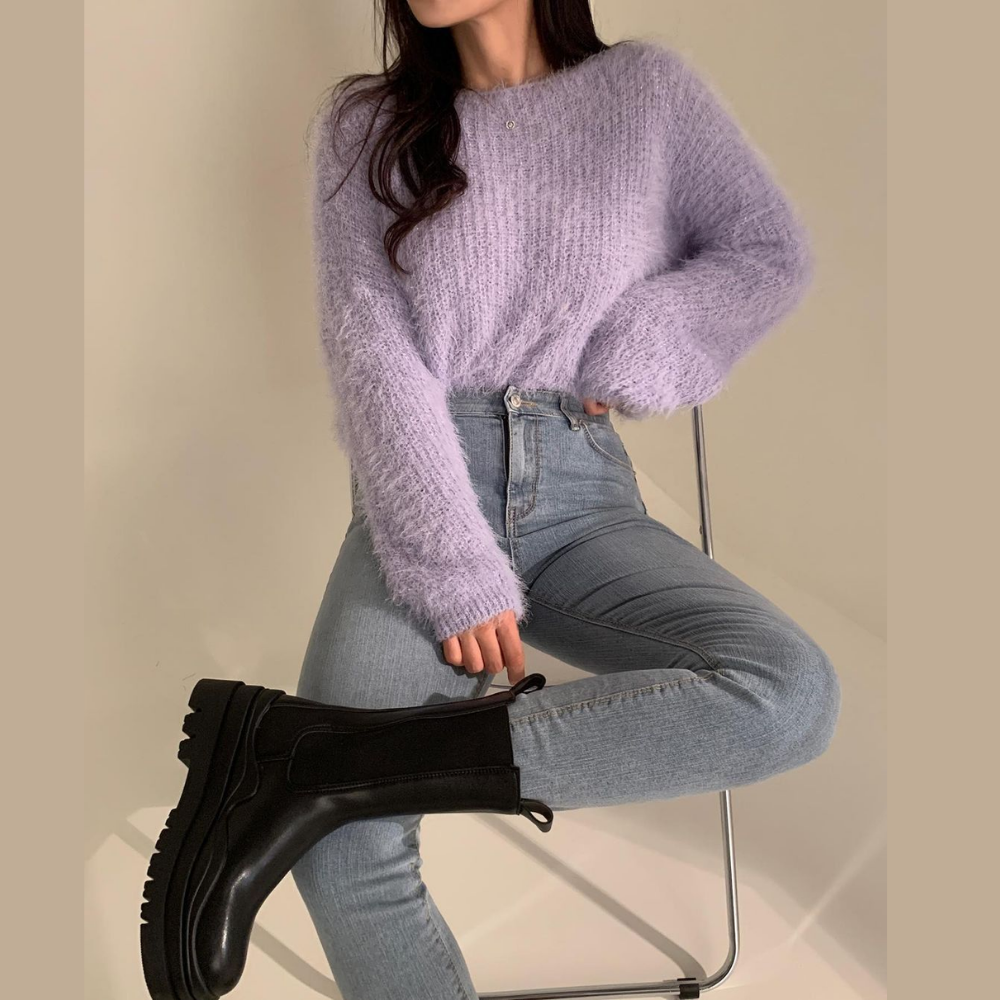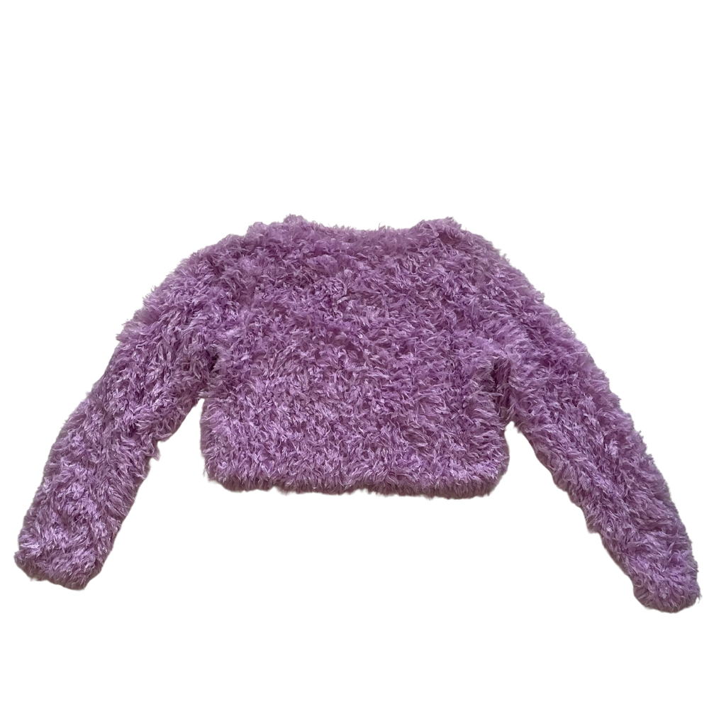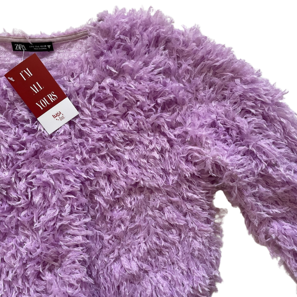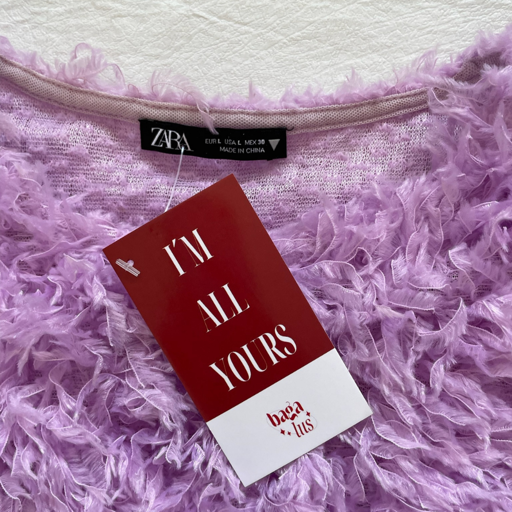 Confeccionado en tejido sintético de textura ultra suave tipo peluche, este suéter corto en tono lila destaca por su volumen esponjoso y efecto visual envolvente. Su cuello redondo y mangas largas aportan equilibrio a la silueta cropped, creando una pieza llamativa, divertida y con un aire cozy-statement.
