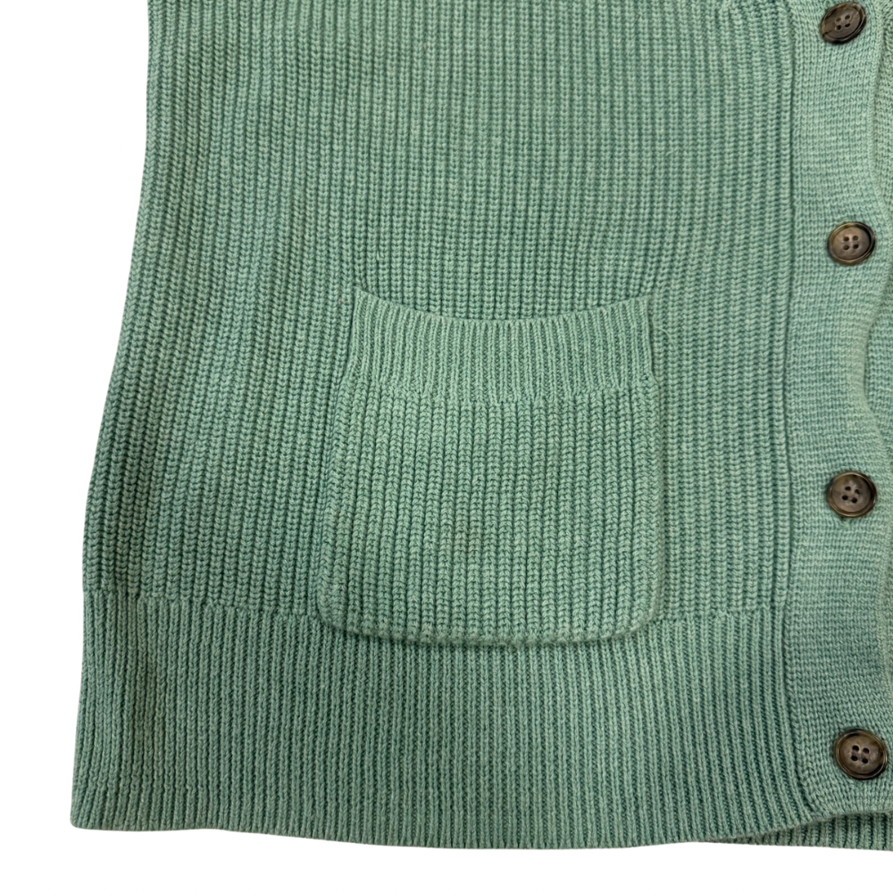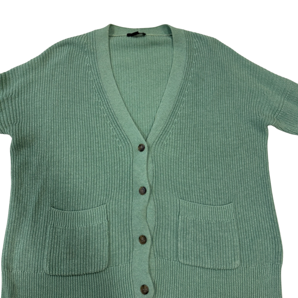 Suéter tejido en tono verde con botones frontales y bolsillos. Tiene un fit oversize, lo que lo hace perfecto para un look relajado pero con estilo. Recomendamos si eres talla L o si quieres lograr ese efecto suelto y moderno.