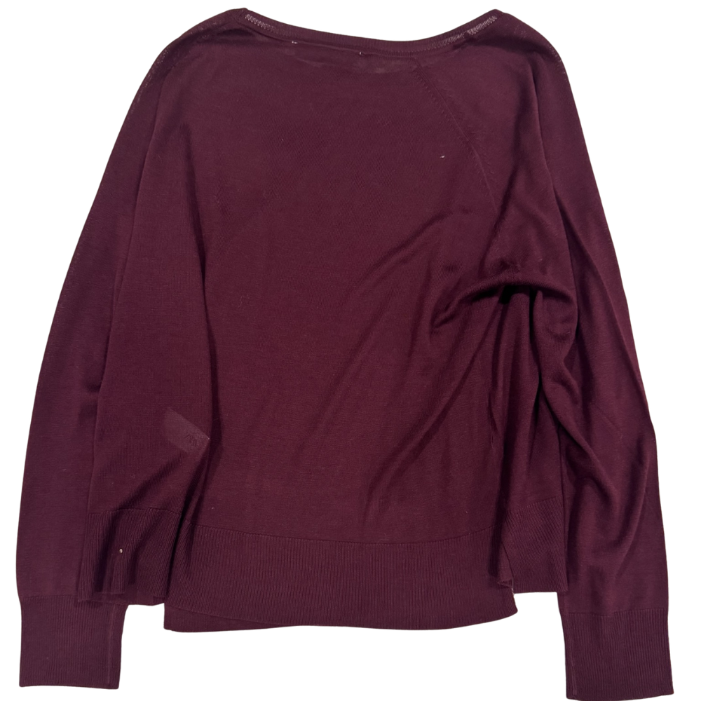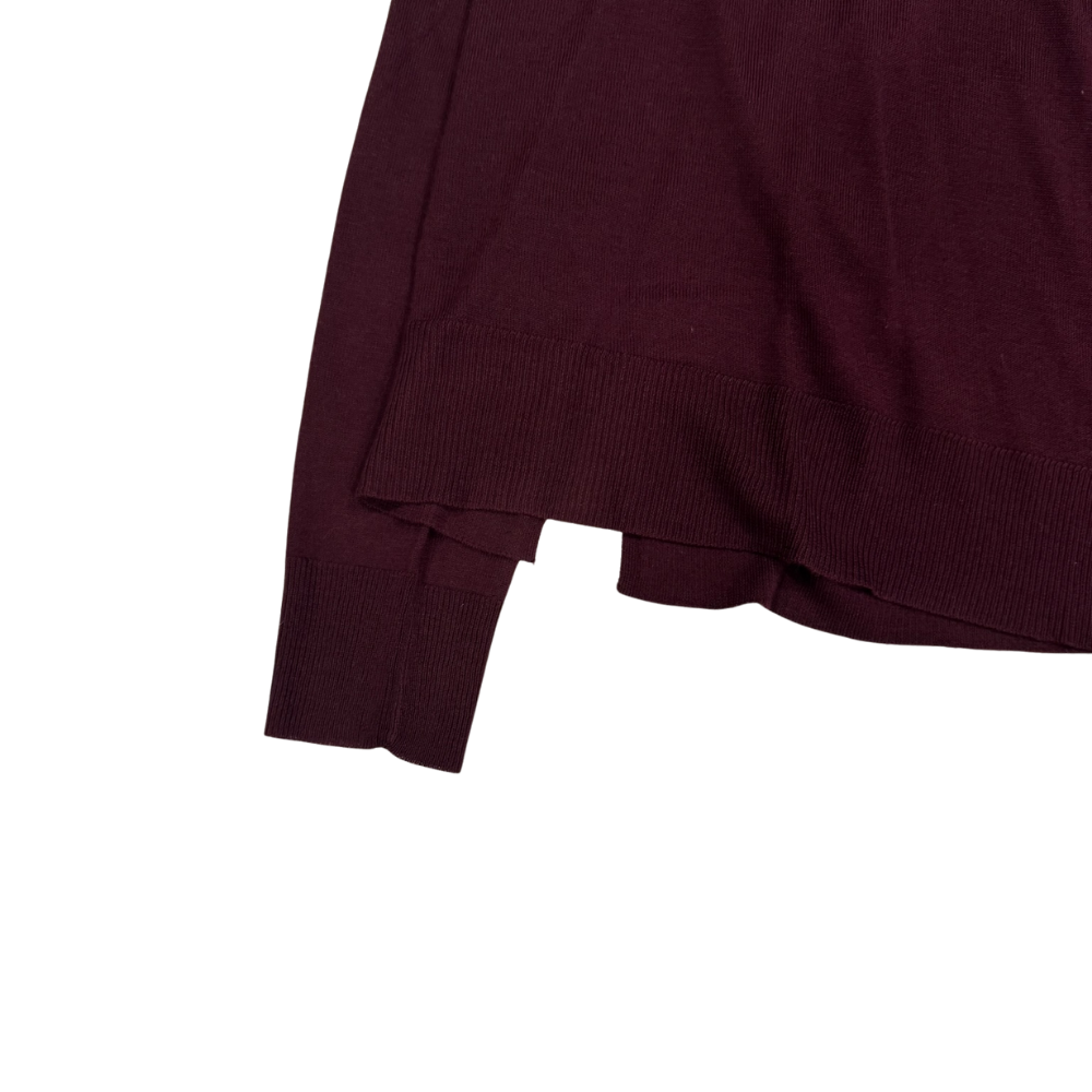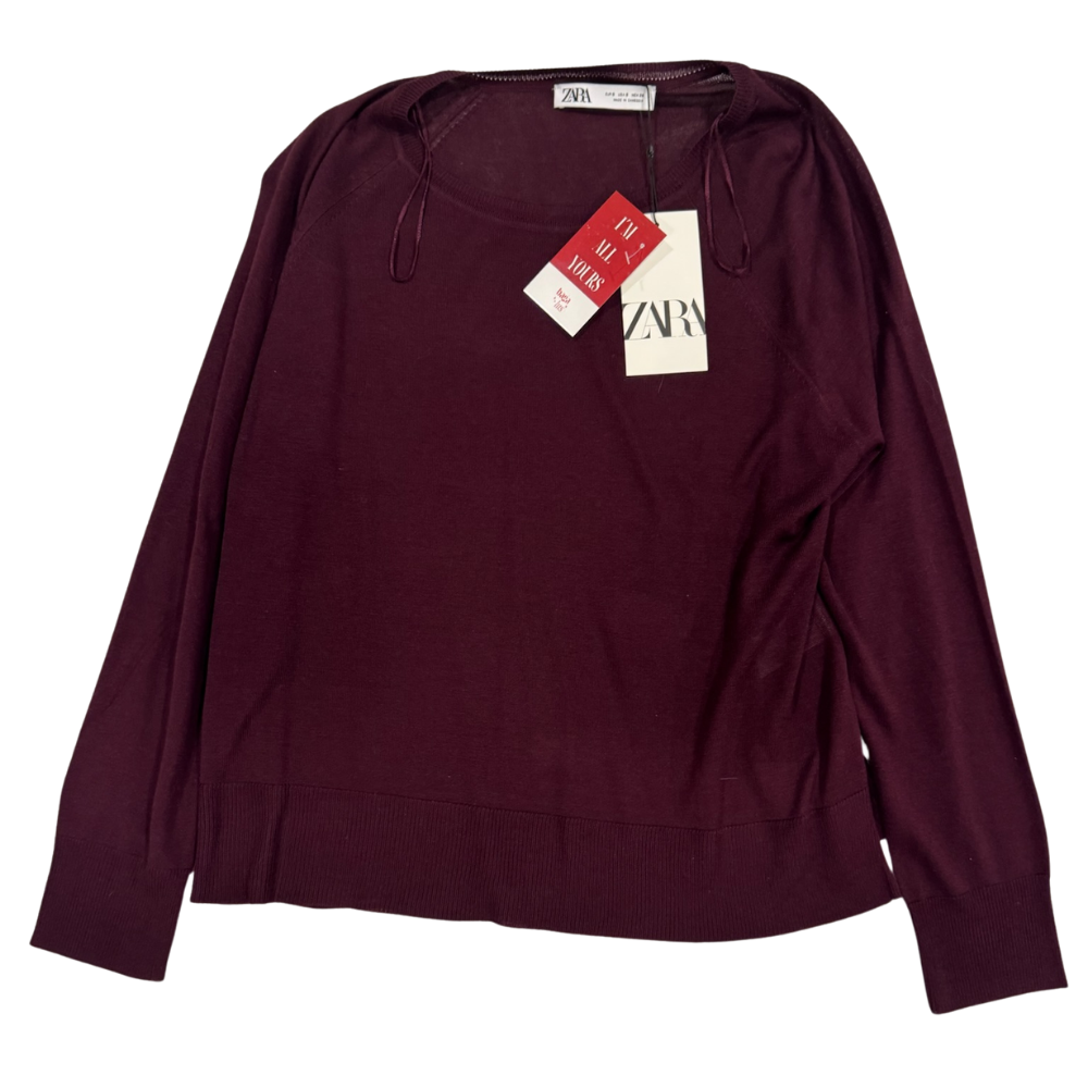 Suéter de punto en tono borgoña profundo, de silueta relajada y corte clásico. Presenta cuello redondo amplio con detalle de cordones ajustables, mangas largas con hombro ligeramente caído y terminaciones en rib en puños y bajo para un acabado cómodo y estilizado. Su tejido suave y ligero lo hace perfecto para looks casuales de entretiempo o capas en climas más fríos.