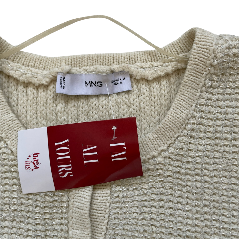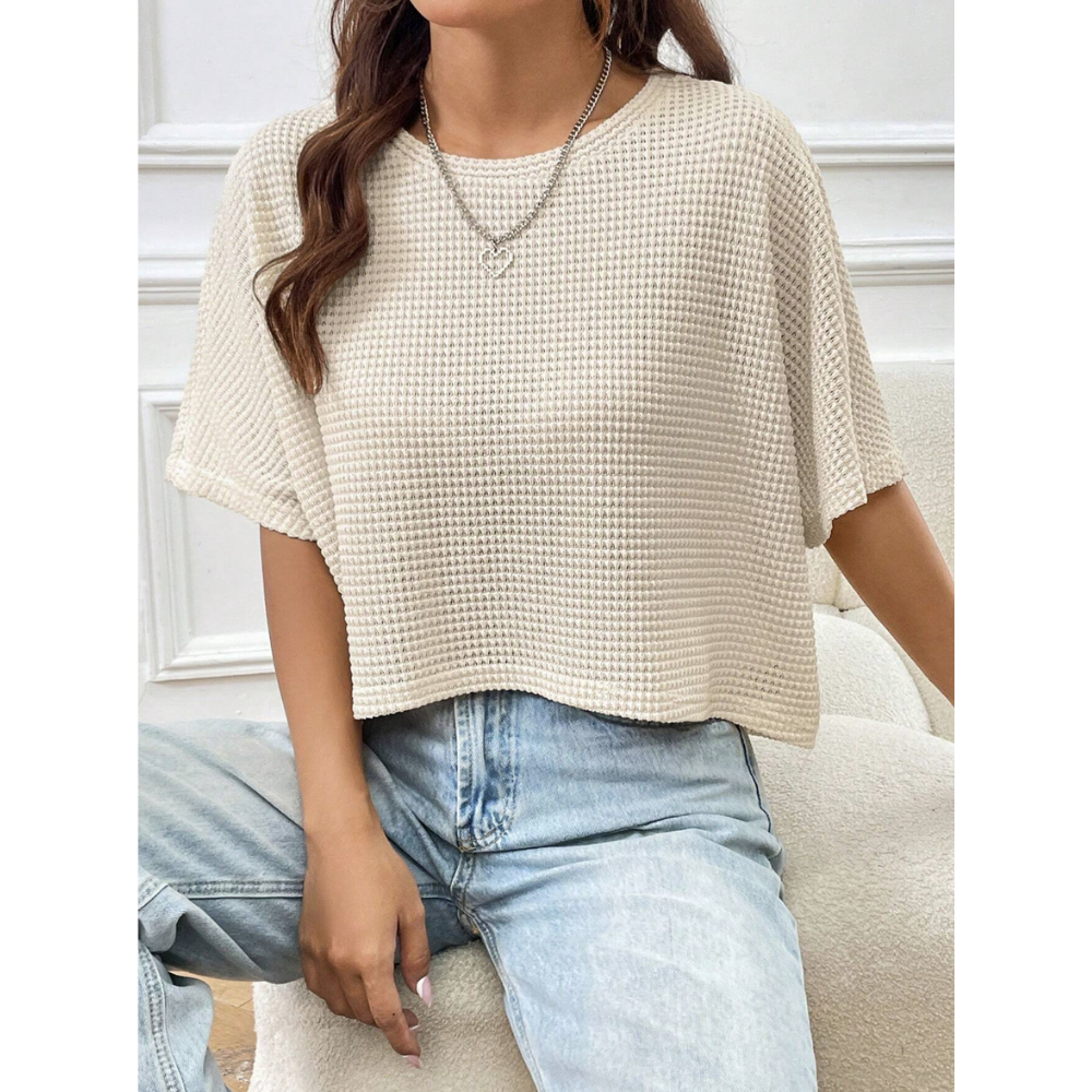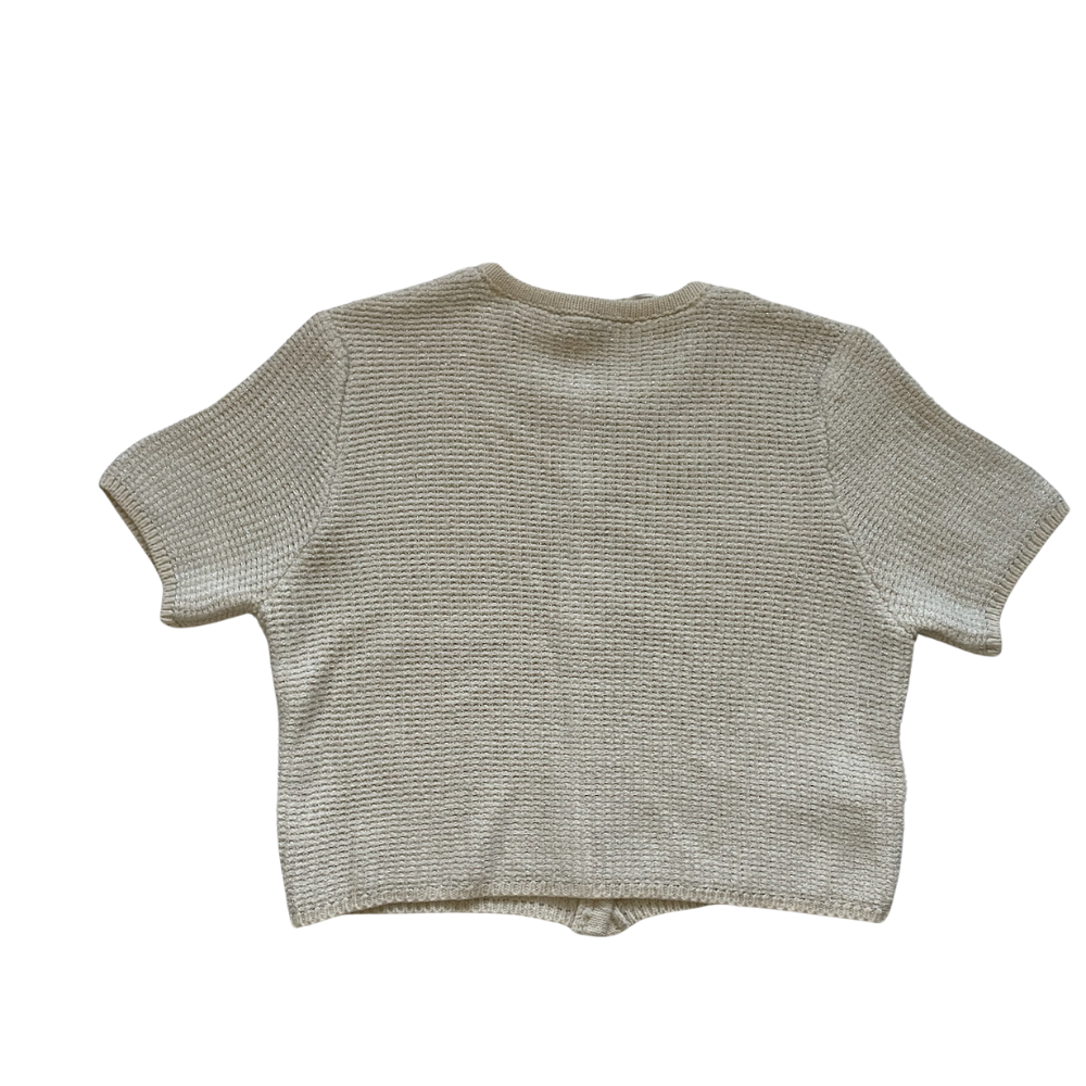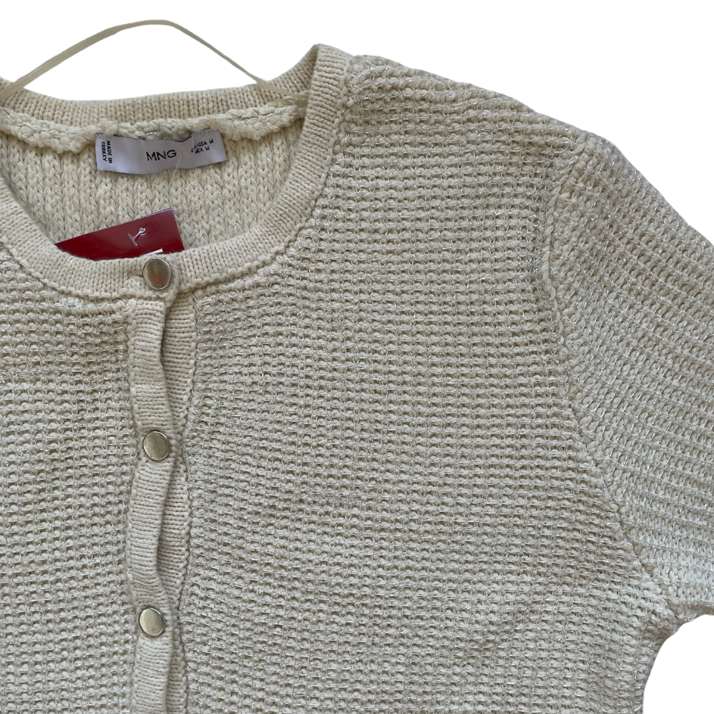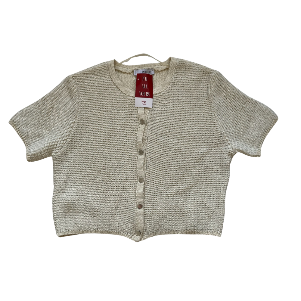 Confeccionado en tejido grueso de textura tipo waffle, este cardigan de corte cropped destaca por su diseño limpio, cuello redondo y botonadura frontal metálica que aporta un toque sutilmente sofisticado. Su estructura ligera y silueta relajada crean una pieza fresca, atemporal y con encanto natural.