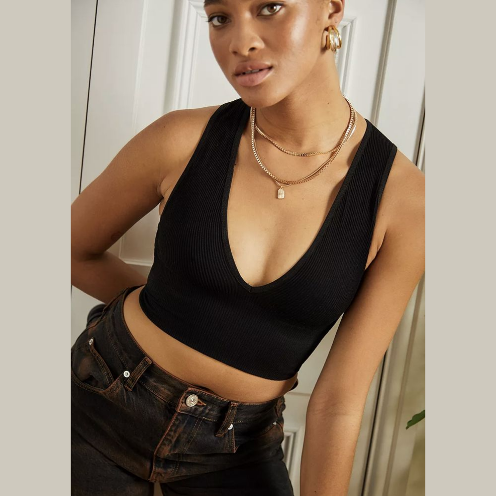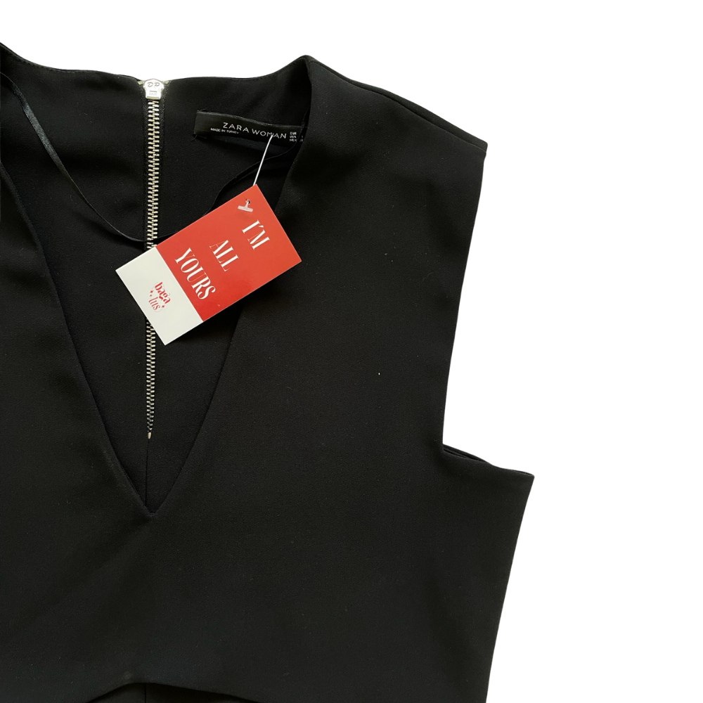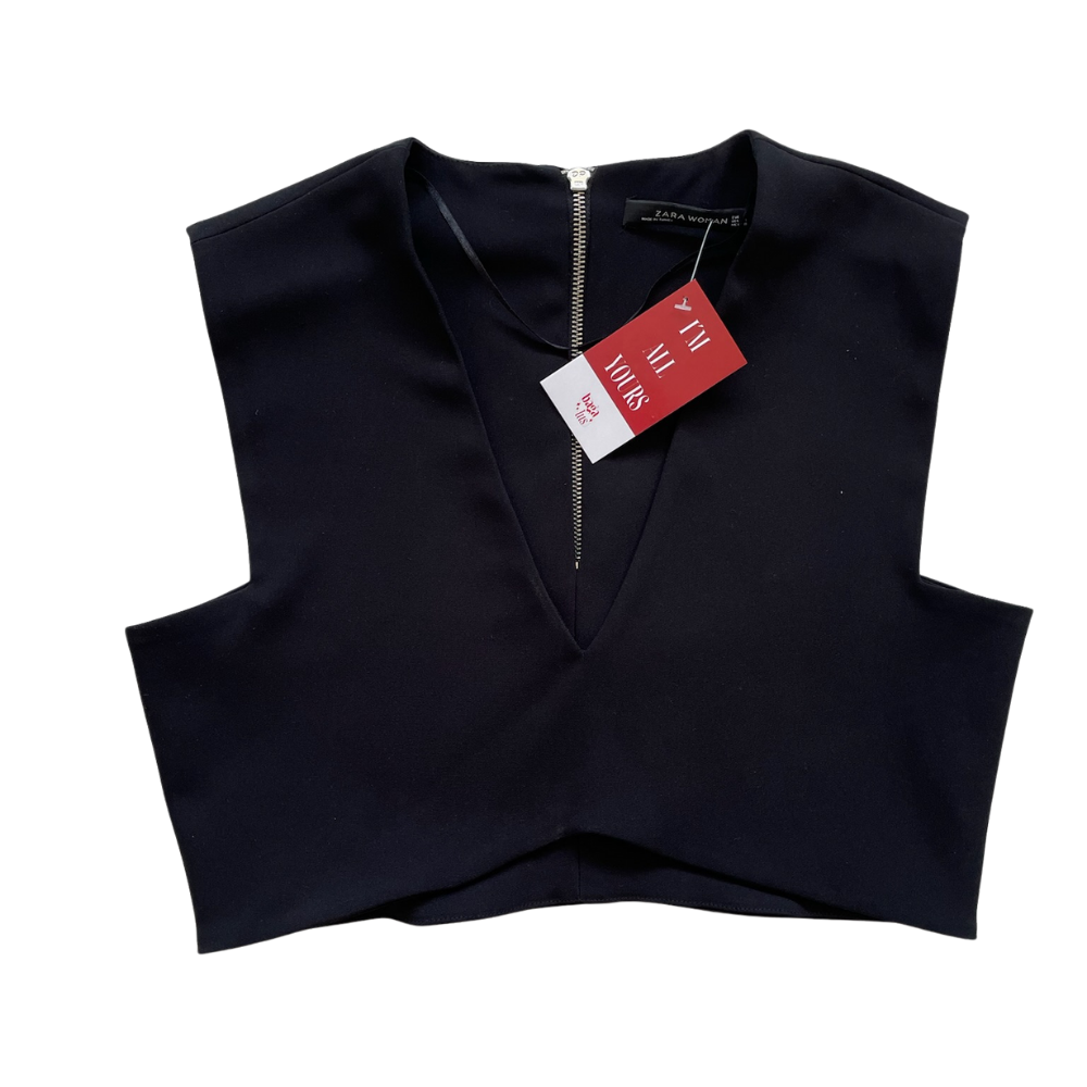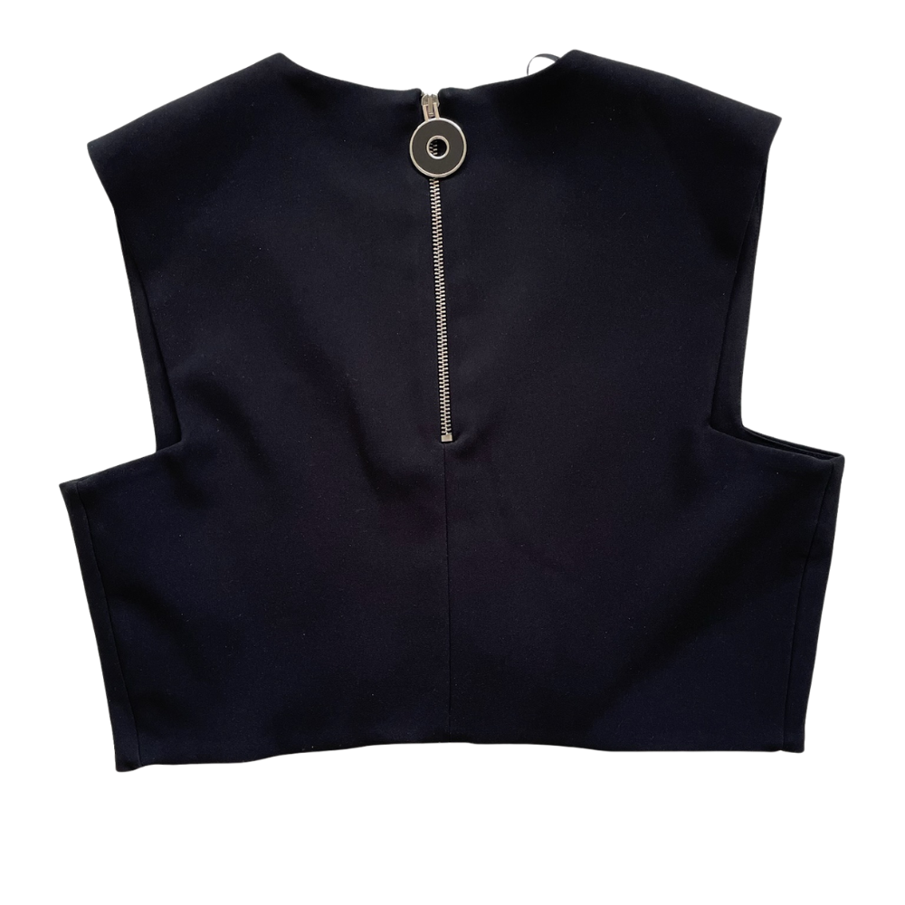 Confeccionado en tela firme y ligeramente elástica, este top destaca por su estructura limpia y escote en V profundo, que aporta un efecto estilizador y moderno. Su diseño sin mangas y líneas definidas crean una silueta pulida, minimalista y con carácter.